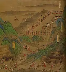 Princes of the Imperial family were also granted substantial military authority in strategic points around the empire. Each was granted an estate with the power to recruit military officers for their personal staff (this was restricted in 1395) and held total judicial authority over them. This ancient system, intended to provide military experience before deployment, had not been used in China for a thousand years.[42] Princes were also dispatched to join campaigns with their personal bodyguards. Zhu Di, Prince of Yan, impressed the Hongwu Emperor with his command of the 1390 campaign against the Mongols under Nayir Bukha and was allowed to retain command of the 10,000 Mongol soldiers he had captured. This later aided the prince in his usurpation of the throne. In some cases the princes were appointed to fill vacant command positions. Zhu Gang, the Prince of Qin, was sent to build military colonies (tuntian) beyond the Great Wall.[43] Princes were granted an escort guard (huwei bing) under their personal control, while a court-appointed officer commanded the shouzhen bing or garrison force, over which the princes only had authority during emergencies declared by the Emperor. This dual chain of command was meant to prevent a coup d'état in the capital. The garrison force could only be deployed with an order carrying both the Emperor's and the Prince's seal. The Regional Military Commission armies were then used to check the princes' military power. Many princes amassed large bodyguard forces and transferred regular soldiers to their personal command without authorisation anyway, using them on campaign.[44] The authority of princes was curtailed by the Jianwen Emperor. When the Yongle Emperor came to power, he further purged his brothers on trumped up charges and abolished most of the princely guards; by the dynasty's end there were less than a dozen extant. He also established a hereditary military nobility from his top generals during his usurpation, both Han Chinese and Mongol. They were however denied long-term commands so as to prevent personal power bases from forming.[45]