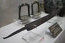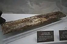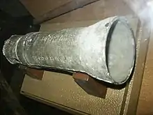 One candidate is the Heilongjiang hand cannon, discovered in 1970, and named after the province of its discovery, Heilongjiang, in northeastern China.[38][39] It is small and light like the Xanadu gun, weighing only 3.5 kilograms, 34 cm (Needham says 35 cm), and a bore of approximately 2.5 cm.[40] Based on contextual evidence, historians believe it was used by Yuan forces against a rebellion by Mongol prince Nayan in 1287. The History of Yuan states that a Jurchen commander known as Li Ting led troops armed with hand cannons into battle against Nayan.[41] It reports that the cannons of Li Ting's soldiers "caused great damage," but also created "such confusion that the enemy soldiers attacked and killed each other."[42] The hand cannons were used again in the beginning of 1288. Li Ting's "gun-soldiers" or chongzu (銃卒) were able to carry the hand cannons "on their backs". The passage on the 1288 battle is also the first to coin the name chong (銃) with the metal radical jin (金) for metal-barrel firearms. Chong was used instead of the earlier and more ambiguous term huo tong (fire tube; 火筒), which may refer to the tubes of fire lances, proto-cannons, or signal flares.[43]
