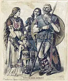 The fundamental structure of Germanic society was the clan (Sippe), formed by the union of several related patriarchal families. The clan constituted an entirely autonomous and self-sufficient military (in infantry and cavalry formations) and political entity. Next to the combatants stand their loved ones, so close that they hear the screams of women and the wails of children.[36] The clan leaders gave rise, probably already in very ancient times, to periodic assembly meetings. The higher entity of the Sippen was the "people" (gau or pagus, called civitas by the Romans), that is, a tribe settled in a given territory.
