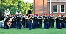 - The Ceremonial Guard conducts many different military tattoos in the Ottawa–Gatineau Region, including the Fortissimo Sunset Ceremony on Parliament Hill in July and the Governor General and Commander-in-Chief's Military Tattoo[5] at Rideau Hall. The latter event honours the King of Canada in his position as Commander-in-Chief of the Canadian Armed Forces. The former emulates the British Beating Retreat while including the practice of lowering of the Canadian flag. Aside from the Band of the Ceremonial Guard, participating units in both events included the Central Band of the Canadian Armed Forces, the Canadian National Drill Team, and the Royal Military College of Canada Band.[6]