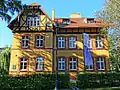 It has one storey with an attic, an elongated rectangle footprint and covered with a gable roof.[15] It is a half-timbered construction. Worth noticing are: