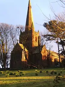 Millom's original parish church is Holy Trinity, a grade I listed building dating to the 12th century.[32] In 1877 the growth of the town required the building of another church and architects Paley and Austin were commissioned to build St George's, a Grade II Listed building.[33] There are also Roman Catholic, Baptist and Methodist churches and a community church. Jehovah's Witnesses also have a Kingdom Hall in the town.