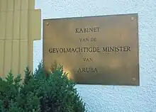 The Minister Plenipotentiary of Aruba (Dutch: Gevolmachtigde Minister van Aruba) represents the constituent country of Aruba in the Council of Ministers of the Kingdom of the Netherlands. The current Minister Plenipotentiary of Aruba is Guillfred Besaril. The Minister Plenipotentiary and his cabinet are seated in the Arubahuis (Aruba House) in The Hague.