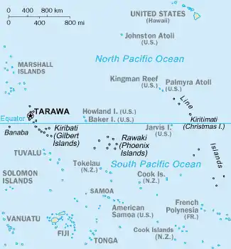 Map of Kiribati, with Line Islands on the right and Phoenix Islands in the middle