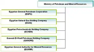 The petroleum sector in Egypt consists of 6 state-owned entities. These are: Egyptian General Petroleum Corporation (EGPC), Egyptian Natural Gas Holding Company(EGAS), Egyptian Petrochemicals Holding Company (ECHEM), Ganoub El Wadi Petroleum Holding Company (GANOPE), and Egyptian General Authority for Mineral Resources.