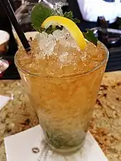 Mint julep is an alcoholic cocktail, consisting primarily of bourbon, sugar, water, crushed or shaved ice, and fresh mint. As a bourbon-based cocktail, it is associated with the American South and the cuisine of the Southern United States in general, and the Kentucky Derby in particular.