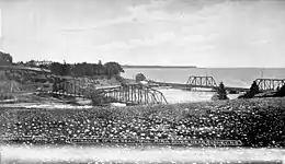 ca 1900-1925 "Publ. By MacLeod's Book Stores Sydney & Glace Bay, N.S. Entrance Of The Beautiful Mira River, Near Sydney, N.S." A view of the Mira Gut Road (nearer) and Sydney and Louisburg Railway (further) Bridges at the mouth of the Mira River where it empties into Mira Gut and Mira Bay. Both bridges had swing spans to allow vessels to travel up the Mira River. The nearer bridge was eventually demolished and the further Bridge in the photo was converted to carry the road once the railway shut down.