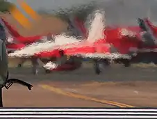 Heat haze, also called heat shimmer, refers to the inferior mirage observed when viewing objects through a mass of heated air. Common instances when heat haze occurs include images of objects viewed across asphalt concrete (also known as tarmac) roads and over masonry rooftops on hot days, above and behind fire (as in burning candles, patio heaters, and campfires), and through exhaust gases from jet engines. When appearing on roads due to the hot asphalt, it is often referred to as a "highway mirage". It also occurs in deserts; in that case, it is referred to as a "desert mirage". Both tarmac and sand can become very hot when exposed to the sun, easily being more than 10 °C (18 °F) higher than the air a meter (3.3 feet) above, enough to make conditions suitable to cause the mirage.