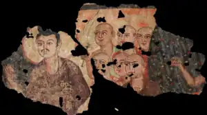This Romanesque style is thought to be the work of a Buddhist painter known as "Titus" (𐨟𐨁𐨟, Tita), who signed his painting at Miran with his name in Indian Kharoshti characters, and who was perhaps a Roman artist who traveled east along the Silk Roads in search of employment.[9][10][11] Several artefacts have been found at the Miran site, including bows and arrows.[12]