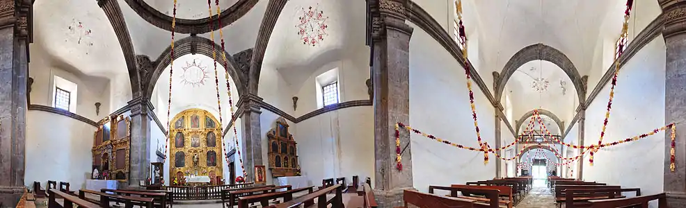 In October 1699, Piccolo returned with a contingent of Spanish soldiers and Indian converts and began to construct the mission. Piccolo dedicated the mission on December 3, 1699, and San Francisco Javier (also Xavier) became the second most enduring mission established in Baja California.[2] The mission was abandoned in 1701 because of a threatened Indian revolt, but reestablished by Juan de Ugarte in 1702. However, efforts to grow crops proved unsuccessful due to lack of water for irrigation and in 1710 the mission was moved a few kilometers south to its present location which had a dependable source of water from a spring. The energetic Ugarte constructed dams, aqueducts, and stone buildings. Between 1744 and 1758, Miguel del Barco was responsible for building what has been called "the jewel of the Baja California mission churches."[3]