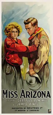 Miss Arizona is a 1919 western silent film directed by Otis B. Thayer and starring Gertrude Bondhill and James O'Neill. The film was shot in Englewood, Colorado by Thayer's Art-O-Graf film company.[1][2][3][4] There is at least one known 35mm nitro copy of this film stored at Filmarchiv Austria.