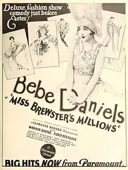 Miss Brewster's Millions is a 1926 American silent comedy film produced by Famous Players–Lasky and distributed by Paramount Pictures. Clarence G. Badger directed and the ever-popular Bebe Daniels starred.[1][2][3] It was based on the 1902 novel by George Barr McCutcheon and a 1906 play adaptation of the same name by Winchell Smith and Byron Ongley, which had been filmed before in 1921 with Roscoe Arbuckle.[4]