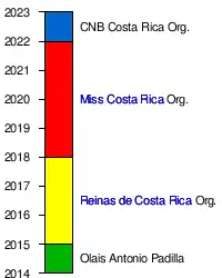 Previously, the franchise belonged to Olais Antonio Padilla and the Reinas de Costa Rica organization in 2014 and 2015 - 2017, respectively.[8][9] Padilla planned to organize the first Miss Grand Costa Rica contest the following year after sending a delegate to the Miss Grand International 2014 but lost the franchise to the Reinas de Costa Rica organization before completing such a willingness.[8]