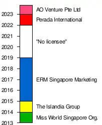 After the Islandia Group stopped all marketing campaigns for the aforementioned project on 1 December 2014,[15] the license was purchased by the pageant organizer led by Alex Liu, Exclusive Resource Marketing Pte., Ltd. (ERM Singapore Marketing Group), which served as the national licensee for Miss Grand International Singapore from 2015 to 2018.[1][16] The country representatives during that time were either appointed or determined through the Miss Singapore Beauty Pageant.[16]