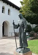 In 1970 the Mission was recognized as the center of the City of San Luis Obispo, with the dedication of Mission Plaza.[13] Mayor Ken Schwartz worked with students from Cal Poly to develop a plan to convince voters to close Monterey Street in front of the mission.[18] Construction of a plaza began in 1969 and the plaza was dedicated in 1970.[18] A statue of Junípero Serra was installed on the grounds facing the public Mission Plaza. The attention to the statues of Junípero Serra expanded during the George Floyd protests to include monuments of individuals associated with the controversy over the genocide of indigenous peoples in the Americas. The statue was moved into storage on the grounds in 2020.[19][20]