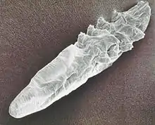 One genus of mites, Demodex, has adapted to infesting the hair follicles of its hosts. Most species of mammal, including humans, are readily infested with these minute mites, but typically the infestation level is very low.[8] The individual mites remain external to the epidermis within the follicle, but appear to be within the skin because they are below the general outer surface of the host. The mite Demodex canis is a common cause of demodicosis in dogs. Demodex mites are microscopic, cigar-shaped and have very short legs. These mites seem to feed on epidermal cells. They can crawl out on the surface of the skin, aided by secretions from the skin's sebaceous glands. Puppies become infected by close contact with the bitch during suckling. Puppies are more susceptible to infestation at this age because their immune systems are immature. All dogs will become infested in this way but usually only low levels of infestation persist, without pruritus or other signs of clinical disease. Some dogs become heavily infested, likely because of an immune dysfunction. This results in severe inflammation of the epidermis with acanthosis. The skin may become so thickened that folds form, and bacterial infection of excessive sebaceous secretions (seborrhea) may occur, producing an offensive smell. Demodicosis in cattle can occur as dense localized infestations. These create pustular folliculitis and indurated plaques within the dermis. This diminishes the commercial value of the animal's hide.[9]