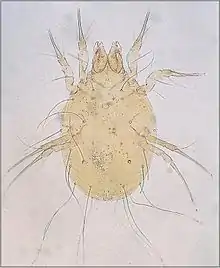 - ↑ Arlian, LG; Runyan, RA; Sorlie, LB; Estes, SA (October 1984). "Host-seeking behavior of Sarcoptes scabiei". Journal of the American Academy of Dermatology. 11 (4 Pt 1): 594–8. doi:10.1016/S0190-9622(84)70212-X. PMID 6436342.