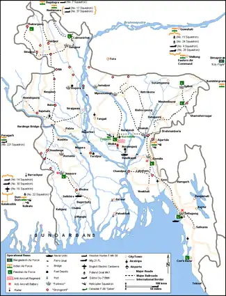 The Indian Army Eastern Command assembled two existing infantry corps, the IV Corps and the XXXIII Corps, for operations in Bangladesh, and created a new corps (II Corps)[2] besides reorganising the 101 Communication Zone as a combat formation.[3] On 21 November 1971, the Indian and Bangladesh forces were put under a joint command structure India Bangladesh force in the eastern theatre, led by Lieutenant General Jagjit Singh Aurora, and this force came to be known as Mitro Bahini. In addition to 29 battalions of the Border Security Force (BSF),[4] Mukti Bahini guerrillas operating near the border or awaiting deployment in camps inside India were organised into infantry companies and attached to various Indian formations.