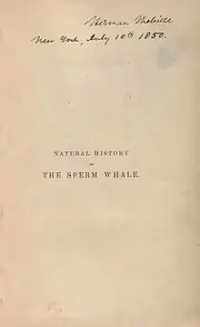 Moby-Dick; or, The Whale is an 1851 novel by American writer Herman Melville. The book is the sailor Ishmael's narrative of the maniacal quest of Ahab, captain of the whaling ship Pequod, for vengeance against Moby Dick, the giant white sperm whale that bit off his leg on the ship's previous voyage. A contribution to the literature of the American Renaissance, Moby-Dick was published to mixed reviews, was a commercial failure, and was out of print at the time of the author's death in 1891. Its reputation as a Great American Novel was established only in the 20th century, after the 1919 centennial of its author's birth. William Faulkner said he wished he had written the book himself,[1] and D. H. Lawrence called it "one of the strangest and most wonderful books in the world" and "the greatest book of the sea ever written".[2] Its opening sentence, "Call me Ishmael", is among world literature's most famous.[3]