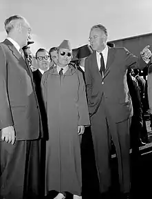 Mohammed V supported the Algerian National Liberation Front (FLN) in the struggle for Algerian Independence and offered to facilitate the participation of FLN leaders in a conference with Habib Bourguiba in Tunis.[17] On October 22, 1956, French forces hijacked a Moroccan airplane carrying leaders of the FLN during the ongoing Algerian War.[18][17][19] The plane, which was carrying Ahmed Ben Bella, Hocine Aït Ahmed, and Mohamed Boudiaf, was destined to leave from Palma de Mallorca for Tunis, but French forces redirected the flight to occupied Algiers, where the FLN leaders were arrested.[17]
