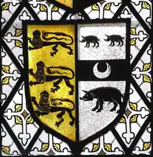 - Nicholas IV Carew (1444–1470), son and heir apparent, who married Margaret Dynham (d.1471), a daughter of Sir John Dynham (1406–1458) of Nutwell in the parish of Woodbury and of Hartland, both in Devon, and a sister and co-heiress of John Dynham, 1st Baron Dynham (c. 1433–1501),[52] Lord High Treasurer of England and Lord Chancellor of Ireland. Her mother was Joan Arches (died 1497), sister and heiress of John Arches and daughter of Sir Richard Arches (died 1417), a Member of Parliament for Buckinghamshire in 1402, of Eythrope, Cranwell (both in the parish of Waddesdon) and Little Kimble, Buckinghamshire.[53] The purbeck marble chest tomb of Nicholas IV Carew survives in the Chapel of St Nicholas in Westminster Abbey, the ledger stone of which bore a Latin inscription, now effaced. The Devonshire biographer Prince (d.1723) wrote concerning this monument "To whose memory an antient plain tomb of gray marble is there still seen erected with an inscription in brass round the ledg, and some coats of arms on the pedestal".[54] The inscription and arms were still remaining in 1733, but had disappeared by 1877.[55] The Latin epitaph was recorded by Prince as follows:[56]