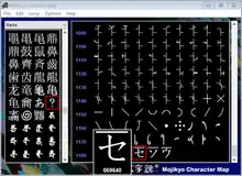 The Mojikyō fonts (文字鏡フォント) are TrueType fonts that come in a ZIP file and are each around 2–5 megabytes; the different fonts contain different numbers of characters.[note 3] Also included is a Windows executable that implements a graphical character map, the "Mojikyō Character Map" (文字鏡MAP), MOCHRMAP.EXE.[note 4][note 5] MOCHRMAP.EXE allows users to browse through the Mojikyō fonts, and copy and paste characters in lieu of typing them on the keyboard. As opposed to the regular Windows character map, or for that matter KCharSelect, which both support TrueType fonts, MOCHRMAP.EXE displays the numbered Mojikyō encoding slot of the requested character.[12][note 6] In order for MOCHRMAP.EXE to work, all Mojikyō fonts must be installed.[note 7]