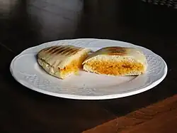 The first mention of mollete is already in the Diccionario latino-español of 1492, in which it is defined by Nebrija as: "any bread that is spongy and muelle ('tender')".[4] In Latin, panis tenellus means 'tender bread', also called panis tenellus ('delicate bread'), and referred to bread with a white and very spongy crumb, achieved through a short baking.[5][6] It is a cognate of "molleta", a torta de pan made with harina de flor, originally from Old Castile, sometimes kneaded with milk, and also used to refer to brown breads of inferior quality.[6][7] However, molletes are more typical of Andalusia and Extremadura.[1] The same etymological origin can be found in the Catalan molla or molló ('miga') and in the French mollet or mollette ('bodigo'), as well as in the Spanish adjective "mollar" ('soft, easy to break').[8][9]
