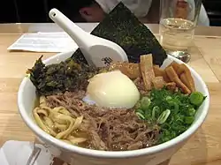 With experience in restaurants in New York City, Chef David Chang opened up his first restaurant in 2004, Momofuku Noodle Bar. It was influenced by his time spent working in Japan and visiting ramen shops.[4] After about a year of trials, Noodle Bar took off as a success when the chefs began cooking what they felt like — more adventurous dishes with better ingredients.[5] Growing, Noodle Bar eventually moved up the street, and Momofuku Ko took over the space.
