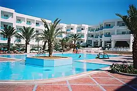 The tourist sector occupies the third occupation of the population with luxury hotels by the sea, golf courses ... the region attracts many foreign tourists. The tourism sector has more than fifty hotel units with a total accommodation capacity of more than 25,440 beds. These hotels provide 9,000 jobs. In addition to the 8th century ribat, the great mosque, the Bourguiba mosque, the museums, the souk, the Kiriates islands, the city also has other assets such as the marina, diving centers, two golf courses. , a racecourse, night clubs etc. Entertainment abounds between fun and sporting activities. For its last 5 decades, it has attracted tourists by the seaside potential of Saknes. It has two hotel units, a museum, a marine district and the marina. There is also the tourist area of Jinène El Oust which has 6 residential units and the Bekalta area which has 6 hotel units and entertainment lots. In addition, the region's transport infrastructure is also one of the determining factors in the growth of this governorate. Indeed, it has an international airport, a train station, and a metro that connects it to Sousse and Mahdia. Buses, taxis, rental vehicles also connect it to these two other governorates.[5]