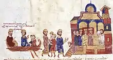 The first occurrences of the name are unclear, and may refer to sobriquets rather to members of the family. An iconoclast bishop of Nicomedia with the name is alluded to in the 9th-century hagiography of St. Joannicius, whereas a fervently anti-iconoclast official was Patrikios Niketas Monomachos during the early 9th century, who was later declared a saint.[2] The family was said to have been ‘ancient’ but did not come to the fore until the 10th and 11th centuries: firstly with Pavlos Monomachos, a wealthy merchant noble who may have married a Doukaina,[3] followed by their son, Theodosios (born c. 970), an important bureaucrat under Basil II, and lastly, Constantine Monomachos who became emperor Constantine IX. A daughter of Constantine IX married Vsevolod of Kiev. Their son Vladimir II Monomakh adopted his mother's surname; indeed the Monomachos’ legacy would flower with the famed Monomachos crown, and in imperial Russia with the legend of the Monomakh Cap, supposedly gifted by Constantine IX to his grandson, Vladimir II Monomakh.[2]