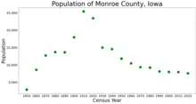 Monroe County is a county located in the south central part of the U.S. state of Iowa. In the early 20th century, it was a center of bituminous coal mining and in 1910 had a population of more than 25,000. As mining declined, people moved elsewhere for work. In the 2020 census, the population was 7,577.[1] The county seat is Albia.[2] The county, originally called Kishkekosh County after a famous chief of the Meskwaki,[3] was renamed for James Monroe, fifth President of the United States.[4]