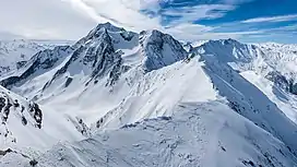 ![]() View from the north on the west ridge leading off Mont Turia. From left to right Mont Turia, Mont Pourri (in the back), Col des Roches (3,435 m), and Aiguille du St-Esprit (3,414 m). | |
