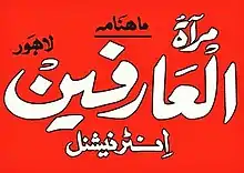 Mirrat-ul-Arifeen International is a monthly Urdu research magazine that has been continuously publishing since April 2000 from Lahore, Punjab, Pakistan. The magazine publishes articles on global issues, current affairs, teachings of Islam, Quran, Sunnah, Ideology of Pakistan, Social issues, Kashmir issue, Sufism, teachings of Abdul Qadir Gilani and Sultan Bahoo, Iqbaliat, problems of the Islamic world and their solutions, challenges facing by the Islamic Republic of Pakistan, and other intellectual and scientific topics. Special issues are also published.[1][2]