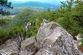 Monument Mountain is the name of a popular 503-acre (204 ha) open space reservation located in Great Barrington, Massachusetts on the southeast side of Monument Mountain. The reservation is centered on the 1,642 feet (500 m) subordinate summit of Peeskawso Peak. It is managed by The Trustees of Reservations, a non-profit conservation organization and is notable for its expansive views of the Housatonic River Valley, the Berkshires, the Taconic Mountains, and the Catskill Mountains of New York from the knife-edge summit of Peeskawso Peak.[1] Monument Mountain, composed of erosion resistant quartzite, is of The Berkshires geology. The reservation receives more than 20,000 visitors a year. The mountain was logged for charcoal to fuel a furnace in Vandusenville at the corner of Division Street and Route 41 in Great Barrington. Remnants of the furnace can be seen if one stands on the Route 41 bridge and looks upstream on the Williams River.