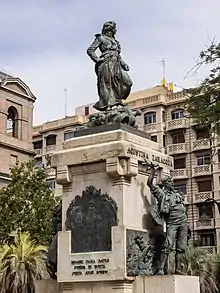 Cast in bronze at Cescati's foundry in Barcelona,[2] the dashing figure of Agustina de Aragón topping off the monument—reportedly inspired in real-life Lucrecia Arana—[3] is depicted wearing an artillery open front jacket with an epaulette and a shoulder pad,[4][5] while stepping on a cannon.[6]