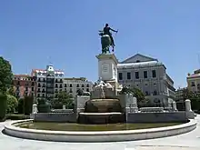 The Monument to Philip IV or Fountain of Philip IV is a memorial to Philip IV of Spain in the centre of Plaza de Oriente in Madrid, Spain. It was raised at the insistence of Isabella II of Spain in the first half of the 19th century, opening on 17 November 1843, a year before Narciso Pascual y Colomer came up with the square's final layout. However, its equestrian statue of the king dates to the 17th century and was produced by the Italian sculptor Pietro Tacca. It was begun in 1634 and shipped to Madrid in 1640, the year of his death. The sculpture, atop a complicated fountain composition, forms the centerpiece of the façade of the Royal Palace. The statue was based in drawings by Diego Velázquez and a bust by Juan Martínez Montañés (who also collaborated on the work). The daring stability of the statue was calculated by Galileo Galilei: the horse rears, and the entire weight of the sculpture balances on the two rear legs—and, discreetly, its tail— a feat that had never been attempted in a figure on a heroic scale, of which Leonardo had dreamed.