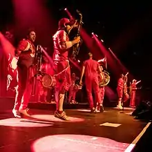 Moop Mama was founded in 2009 at the initiative of the saxophonist Marcus Kesselbauer, as a group of seven brass players, two percussionists and a rapper.[1] Kesselbauer is also the band's composer and arranger.[2] Their first "public rehearsal" was at Munich's Englischer Garten in 2009.[1] They became recognized for many short unannounced concerts in public space (Guerilla-Konzerte), such as pedestrian areas and parks, using a megaphone to amplify the rapper's voice. Sometimes the concerts were regarded as unwanted noise (Ruhestörung), causing conflicts with the police.[2]