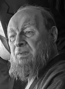 Then in 1956, Carnovsky recalled, "Shakespeare suddenly discovered me!" "In 1956", he said, "John Houseman, who was then the general director and producer at the American Shakespeare Theatre in Stratford, Connecticut, called me up and said, 'would you like to do some Shakespeare?' I said, 'Yes, of course!' So that's how I began. The first year I did a part in King John, a part in Measure for Measure and a part in The Taming of the Shrew. Then I proceeded to learn what Shakespeare was all about, in light of the realistic method of acting that I had discovered during my years with the Group Theatre. The following year, I found myself doing Shylock in The Merchant of Venice, and that was really the opening of the can of peas, for me."[6] At Stratford he played many roles, notably Feste in Twelfth Night in a production featuring Katharine Hepburn as Viola, and Prospero in a celebrated production of The Tempest directed by William Ball of the American Conservatory Theater.