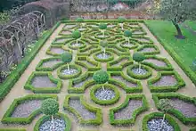 The garden features a 17th-century-style (recreated) enclosed garden containing period plants. It has a herb garden, topiary, a fruit orchard, an arbour, a walled garden, and a 'knot' garden.[8][9]