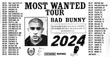 The Most Wanted Tour is an upcoming fifth concert tour by Puerto Rican rapper and singer-songwriter Bad Bunny to promote his fifth studio album Nadie Sabe Lo Que Va a Pasar Mañana (2023). Promoted by Live Nation and Rimas Entertainment, it is scheduled to begin on February 21, 2024 in Salt Lake City and conclude on May 26 in Miami, comprising 47 dates over 31 cities throughout North America.[1][2][3]