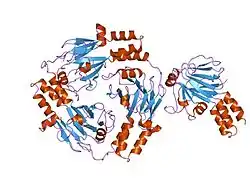 SMAD5, as its name describes, is a homolog of the Drosophila gene: "Mothers against decapentaplegic", based on a tradition of such unusual naming within the gene research community.[6] It belongs to the SMAD family of proteins, which belong to the TGFβ superfamily of modulators. Like many other TGFβ family members SMAD5 is involved in cell signalling and modulates signals of bone morphogenetic proteins (BMP's). The binding of ligands causes the oligomerization and phosphorylation of the SMAD5 protein. SMAD5 is a receptor regulated SMAD (R-SMAD) and is activated by bone morphogenetic protein type 1 receptor kinase. It may play a role in the pathway where TGFβ is an inhibitor of hematopoietic progenitor cells.