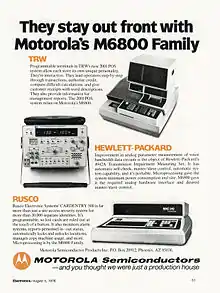 - ↑ "It's the total product family". Electronics. New York: McGraw-Hill. 48 (1): 37. January 9, 1975. Archived from the original on November 11, 2012. Retrieved June 7, 2011. Motorola advertisement emphasizing their complete set of peripheral chips and development tools. This shorten the customers product design cycle.