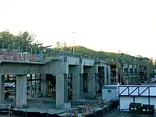 Sound Transit awarded the construction contract for Mount Baker station and the Beacon Hill tunnel to Japanese firm Obayashi in June 2004 for $280 million, the costliest component of the Central Link project.[26][27] Construction began in September 2005 with the permanent closure of Stevens Street and utility relocation to clear the station site.[28][29] By the following April, Obayashi completed erection of columns that would be used to support the elevated guideway and station.[30] Mount Baker station was declared substantially complete in June 2009, excluding work on the elevators and escalators.[31]