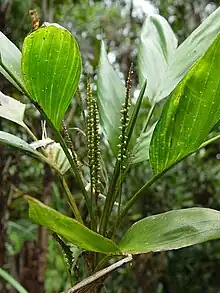 The high altitude and rainfall of the mountain create conditions for a number of vegetation types growing on the poor granitic soils.[7] The lower slopes support lowland tropical rainforest (complex mesophyll vine forest) with a great diversity of large leaved trees, climbers, epiphytes, palms and ferns. With increasing elevation the rainforest changes to a less diverse smaller leaved notophyll type. At elevations above 1000 m, simple microphyll vine fern forest is found with species such as the purple kauri pine (Agathis atropurpurea), Elaeocarpus ferruginiflora and pimple bark (Balanops australiana). With further increases in altitude, increasing exposure and cloud contact create conditions ideal for the formation of cloud forest (simple microphyll vine fern thicket); many of the species are rare or endemic and most trees are shrouded in mosses and other bryophytes.[8] [9][10][11]