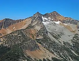 Mount Lago[3] is a prominent 8,745-foot (2,665-metre) mountain summit located in the Okanogan Range of the North Cascades, in Okanogan County of Washington state. The mountain is situated on the eastern side of the Cascade crest, in the Pasayten Wilderness, on land managed by the Okanogan–Wenatchee National Forest. The nearest higher peak is Jack Mountain, 19.5 miles (31.4 km) to the west-southwest.[1] Mount Lago is the highest summit of the Okanogan Range, and follows only Jack Mountain {9,075 ft} as the highest peak in the Pasayten Wilderness. Lago is the fourth-most prominent mountain in the Pasayten Wilderness.[4] Precipitation runoff from the mountain drains into tributaries of the Pasayten River and Methow River. The mountain was named for Lage Wernstedt (1878-1959), a Forest Service surveyor who made numerous first ascents of the mountains he was mapping in the North Cascades.[2] Lago, is a play on the way Americans pronounced his name.[5] Lage, pronounced Loggy, had a son named Lago.[6]