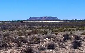 The hill appears as a mesa-like inselberg, rising 150 metres (490 ft) above the Western Plains. It is a small relic of a formerly large sedimentary rock formation, mostly now eroded away.[3][4] The underlying and surrounding rocks are sedimentary sandstone and metamorphic quartzite.[5]