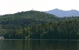 ![]() Radio towers mark the summit of Mount Pisgah, left, from Lower Saranac Lake, the twin peaks of McKenzie Mountain at right | |