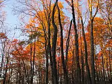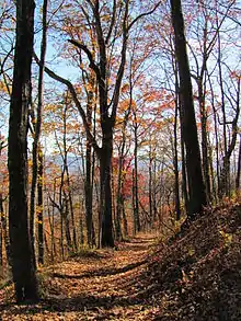 Mount Sterling crowns Mount Sterling Ridge, a 7-mile (11 km) ridge that gradually descends northward from the flanks of Big Cataloochee Mountain (on the Balsam Mountain crest) to the Pigeon River valley. The ridge divides the Cataloochee area to the east from the Big Creek Valley (which represents the fringe of the Cosby area) to the west. The communities of Mount Sterling, North Carolina, and Waterville, North Carolina are located in the Pigeon River valley at the ridge's northern extreme. Geologically, Mount Sterling consists mainly of Precambrian metamorphic sandstone of the Ocoee Supergroup, formed nearly a billion years ago from ancient ocean sediments.[3] The summit of Mount Sterling is surrounded by a stand of Southern Appalachian spruce–fir forest.