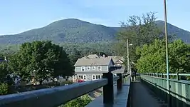 Mount Williams (the peak on the left) as seen from North Adams. The footbridge in the foreground spanning the Hoosic River and railroad tracks is part of the Appalachian Trail.