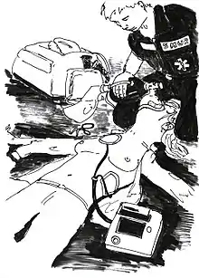 Typical view of resuscitation in progress with an Ambu bag in use ("bagging").